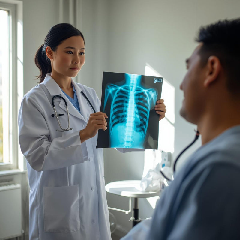 A doctor and patient review an X-ray film, a crucial diagnostic tool used to visualize internal structures and identify fractures or abnormalities.
