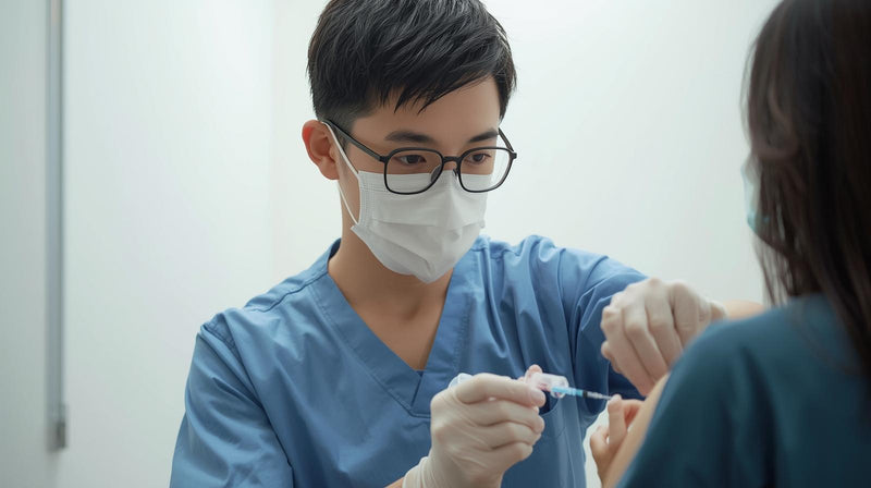 Medical professional gives an injection for vaccination or fast-acting medication, using an alcohol swab to prep the site.